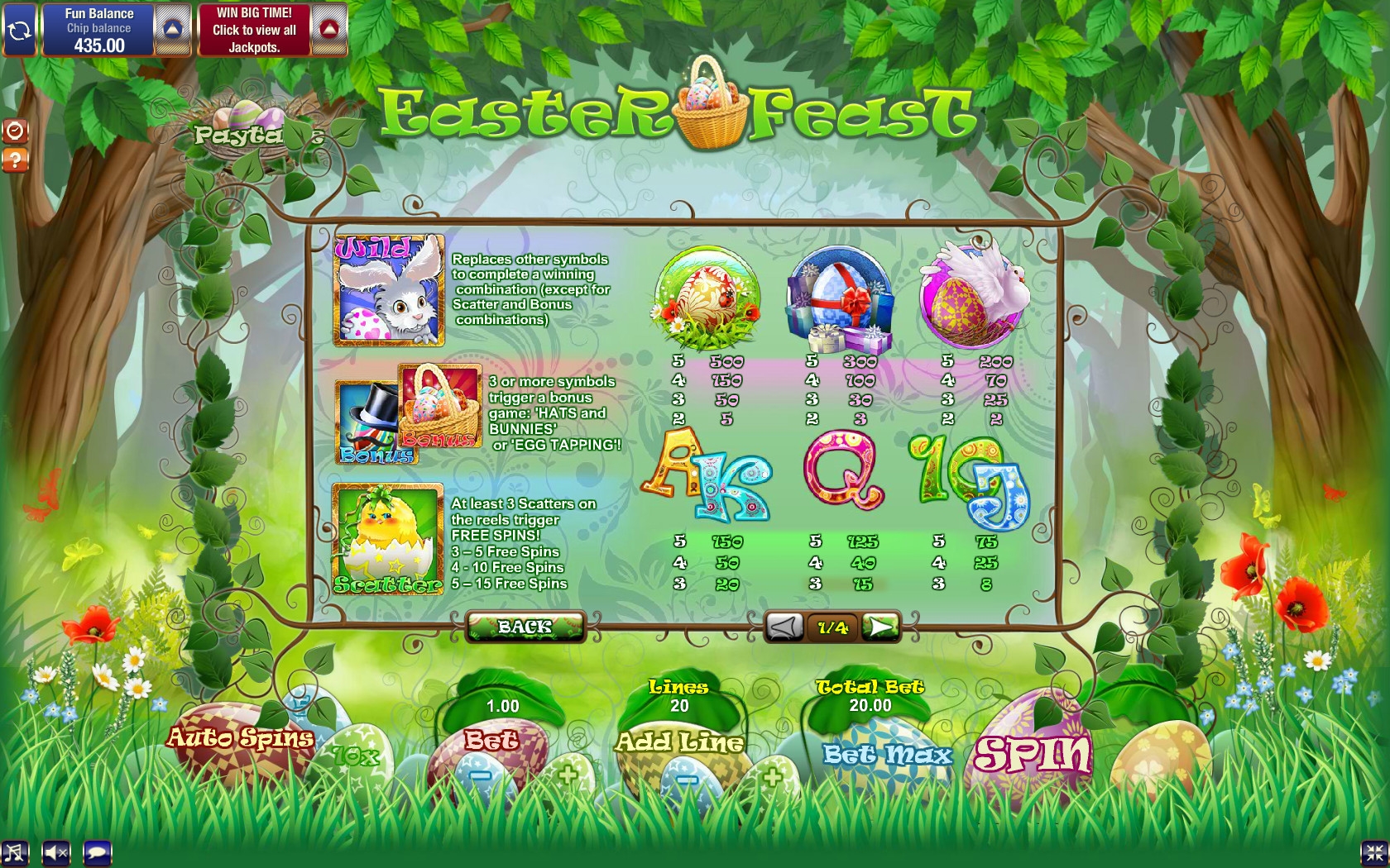 Бесплатно и на деньги слот предлагается в разных казино. Наши обозреватели тестировали «Пасхальный обед» без регистрации в Bet4Joy. Вы можете отдать предпочтение другому заведению. Воспользуйтесь обзорами для выбора наиболее достойного, по вашему мнению.