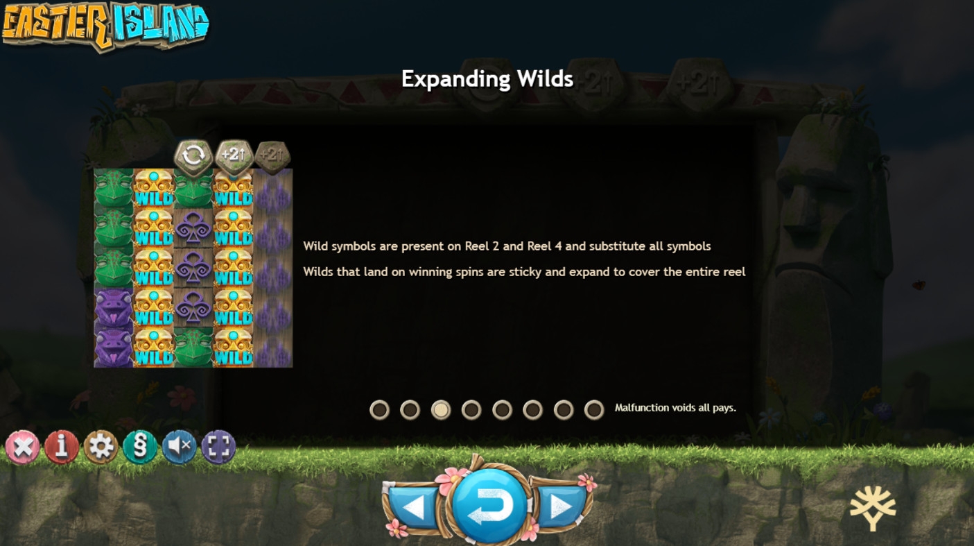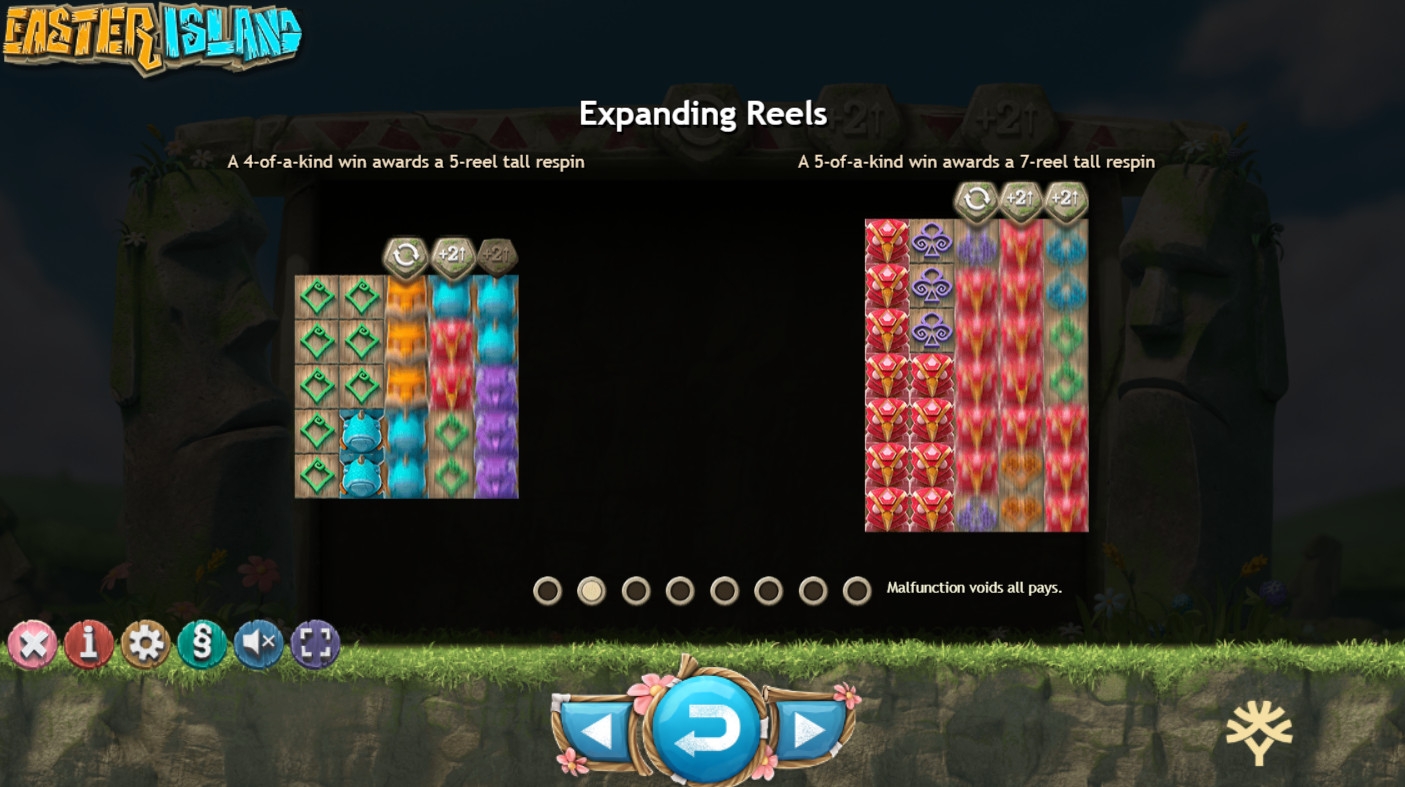 В игровом автомате Easter Island пять барабанов. Количество ячеек для символов и число активных полос не фиксированное. Изначально картинки выстраиваются в три ряда, а игра ведется по двадцати семи линиям. В ходе розыгрышей на экране может быть до тридцати пяти картинок и ста трех полос.