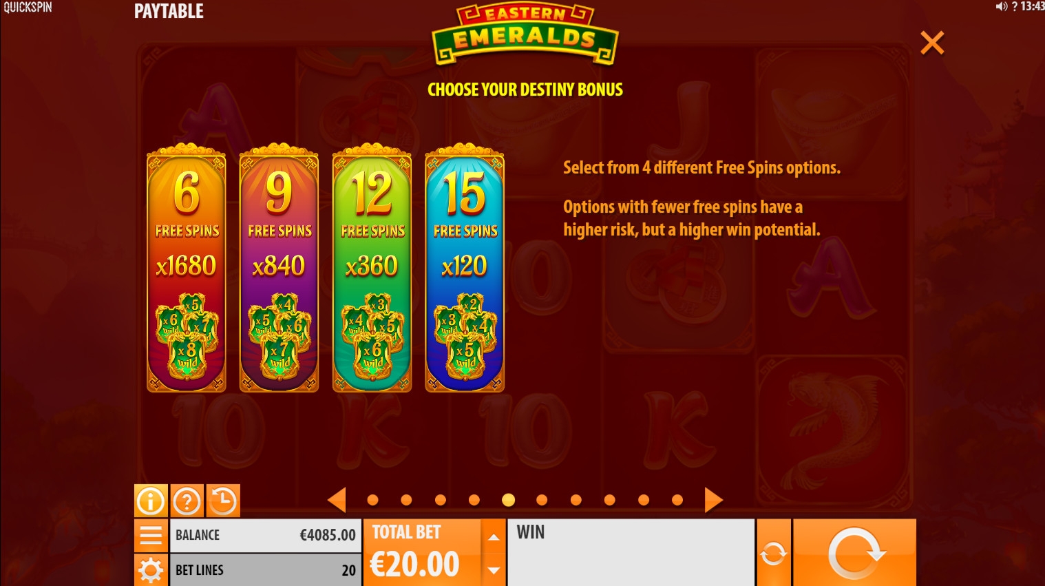 Вы готовы бросить вызов судьбе в игровом автомате Eastern Emeralds студии Quickspin? Он создан по мотивам китайских верований о счастье и удаче. Всех, кто любит риск, ждут крупные выплаты и заманчивые бонусы. А если вы дождетесь трех фениксов на экране, вам предстоит участвовать в потрясающих бесплатных розыгрышах.