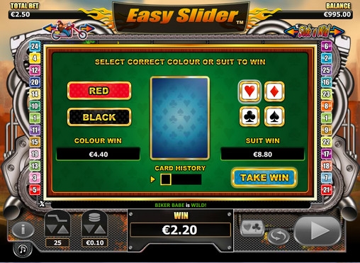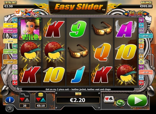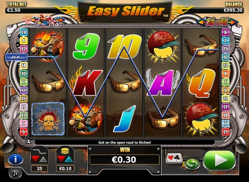 Запустив видео-слот Easy Slider, вы увидите на его барабанах толстого байкера, шлем, эмблему, очки, а также разноцветные буквы и цифры, которые используются для обозначения номиналов игральных карт.