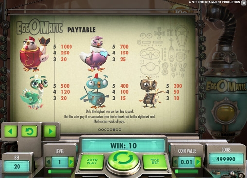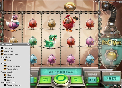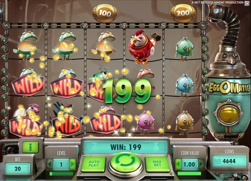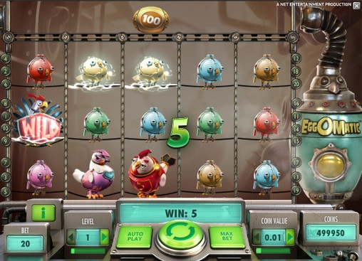 Бьемся об заклад, вам никогда не доводилось бывать на предприятиях, подобных тому, что описано в видео-слоте EggOMatic. Этот бесплатный игровой автомат от компании Net Entertainment приглашает вас на птицефабрику, которую населяют механические куры-роботы, несущие металлические яйца (порой даже золотые). Более того, выбором необычного места действия фантазия разработчиков не исчерпалась. Они также предлагают пользователям оригинальные игровые опции, эффектный дизайн и стильную панель управления.