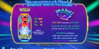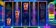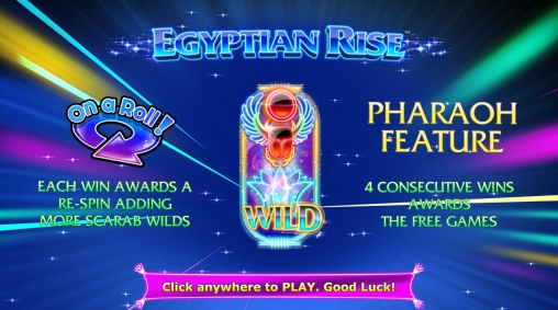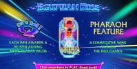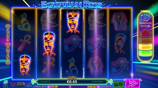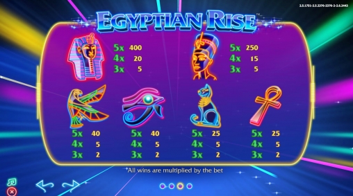 В колонках видео-слота Egyptian Rise появляются изображения фараона, Клеопатры, черного кота и различных священных символов. Внешне они напоминают разноцветные неоновые вывески.