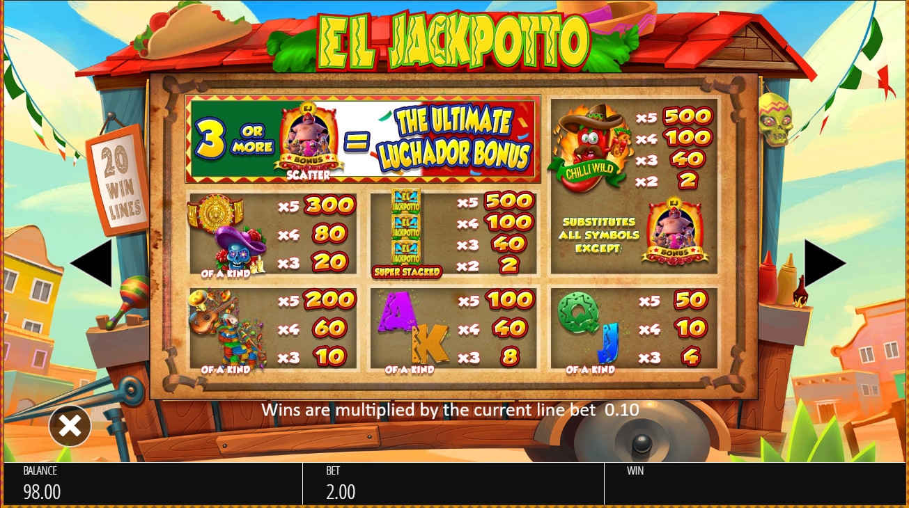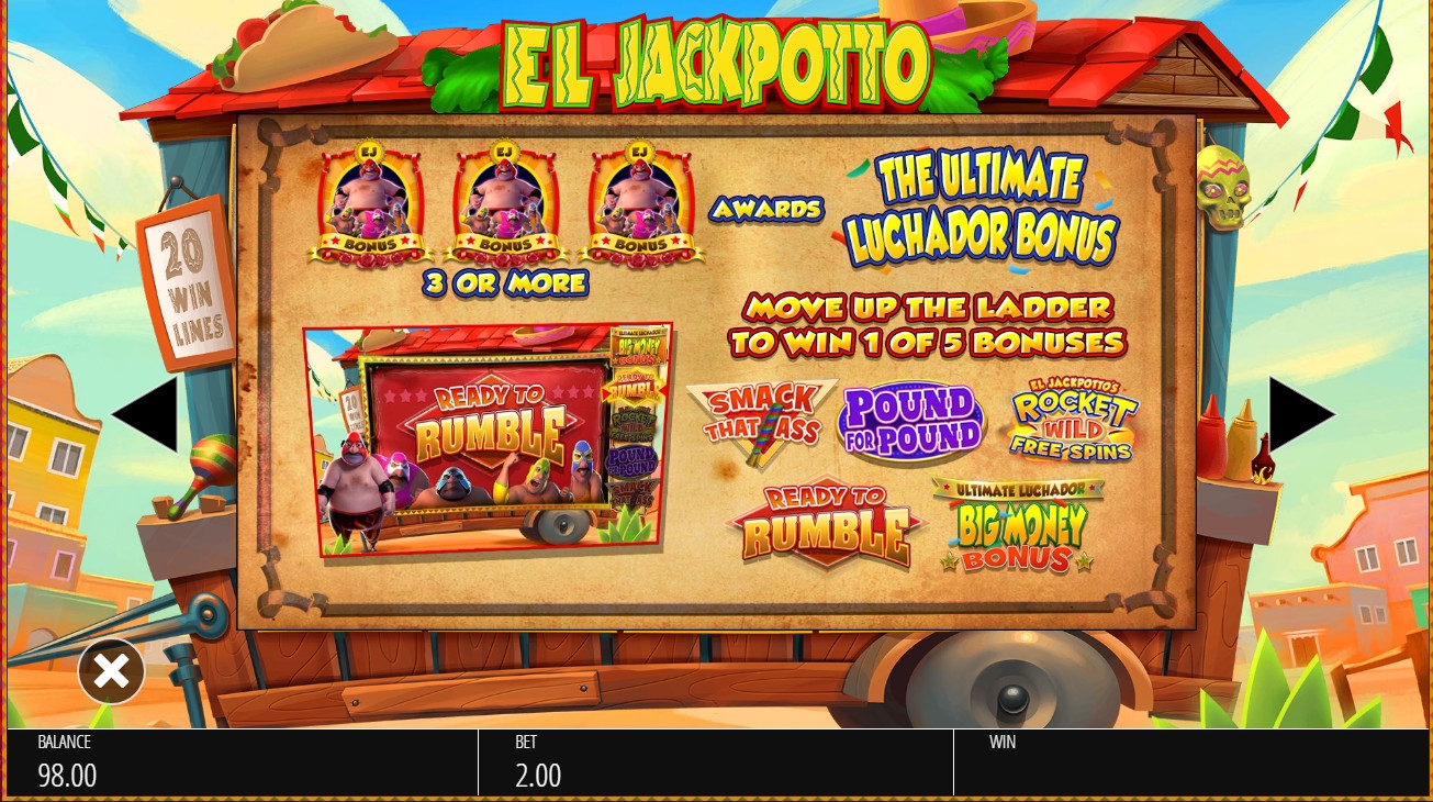 - Bonus (Эль Джекпотто) начинает призовой раунд The Ultimate Luchador. Он запускается тремя, четырьмя или пятью скаттерами, оказавшимися в любых ячейках.