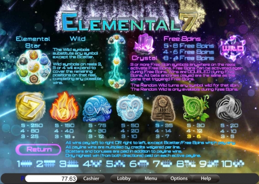Elemental 7 имеет пять барабанов и десять линий, количество которых пользователь может задействовать по своему усмотрению. Символы на экране располагаются в три ряда по наиболее распространенной схеме 5х3.