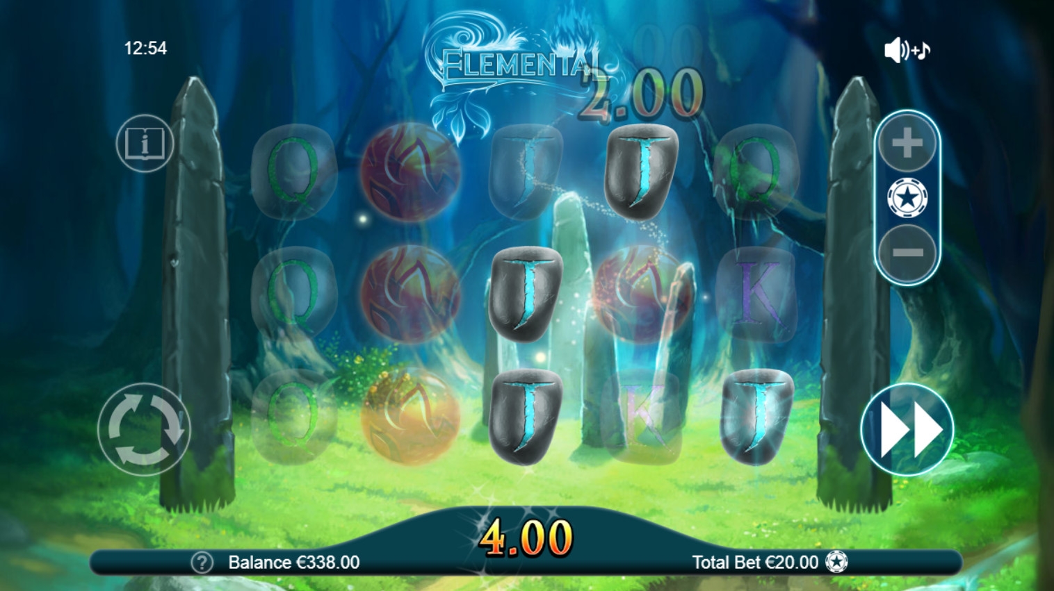 На барабанах изображены круглые камешки, символизирующие четыре стихии природы, а также буквы J, Q, K и А. Одинаковые иконки следуют вертикальными стеками в колонках.