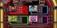 Feature появляется только на девятом, десятом и одиннадцатом барабанах (три последних по порядку). Три таких картинки на одном из трех отдельных экранов (барабаны 1-4, 5-8 или 9-11) запускают бесплатные спины по текущей ставке, во время которых появляется автомат Juke Box, проигрывающий песни Элвиса и дающий дополнительные выгоды (какие именно, вы сможете выяснить самостоятельно).