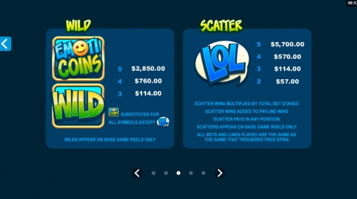 - Scatter (надпись LOL) не зависит от положения на экране. Он приносит выплаты, появляясь в любых ячейках. Выигрыши рассчитываются по общей ставке. От трех скаттеров начинают фри-спины.