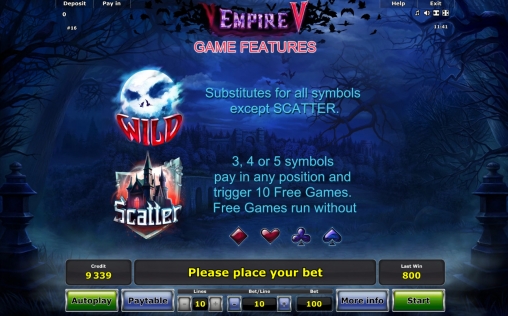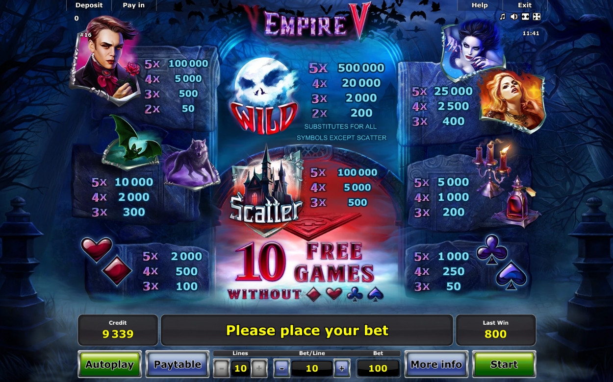 Компания Novomatic в очередной раз порадовала фанатов вампирской тематики новым игровым автоматов. Встречайте модель Empire V, обладающую изысканным дизайном, очень высокими коэффициентами выплат по отдельным комбинациям, выгодными фри-спинами и другими интересными особенностями.