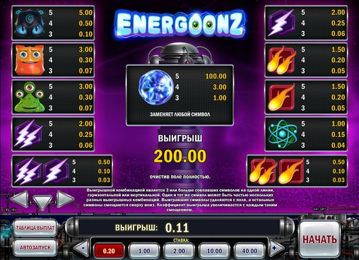В Energoonz есть раздел с настройками и подробная справка. Коэффициенты выплат и краткие правила вы найдете в таблице. Можно играть в автоматическом режиме.