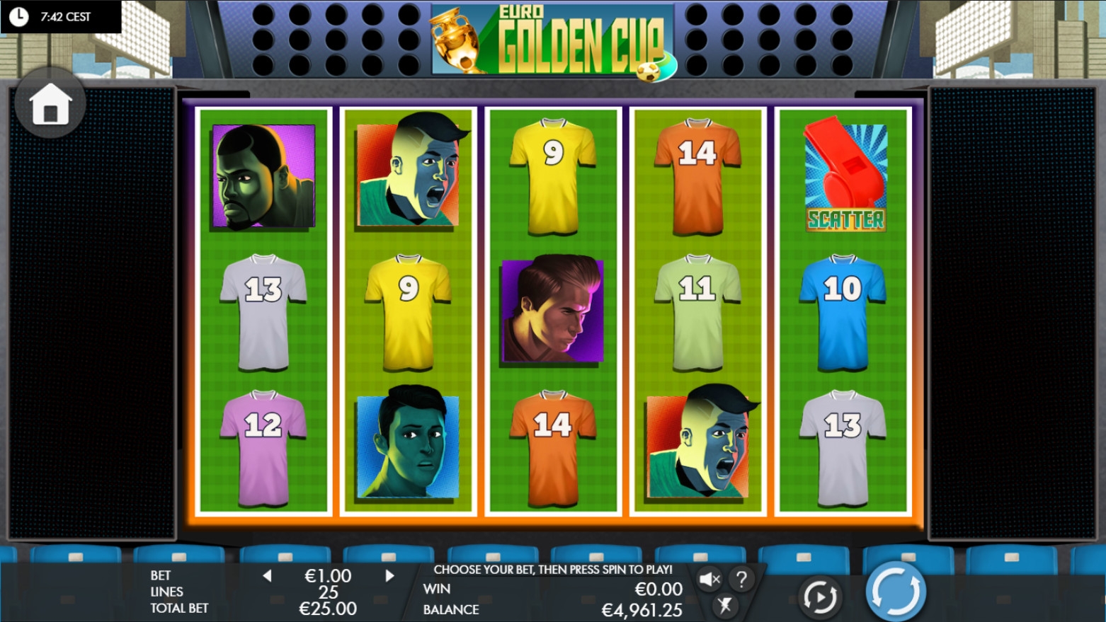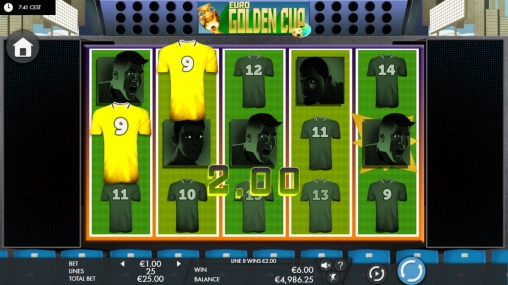 «Золотой Евро-кубок» представляет собой онлайн-слот с пятью барабанами и пятнадцатью символами на основном экране. Играть на игровом автомате разрешается только по двадцати пяти активным полосам, на которых в процессе формируются комбинации.
