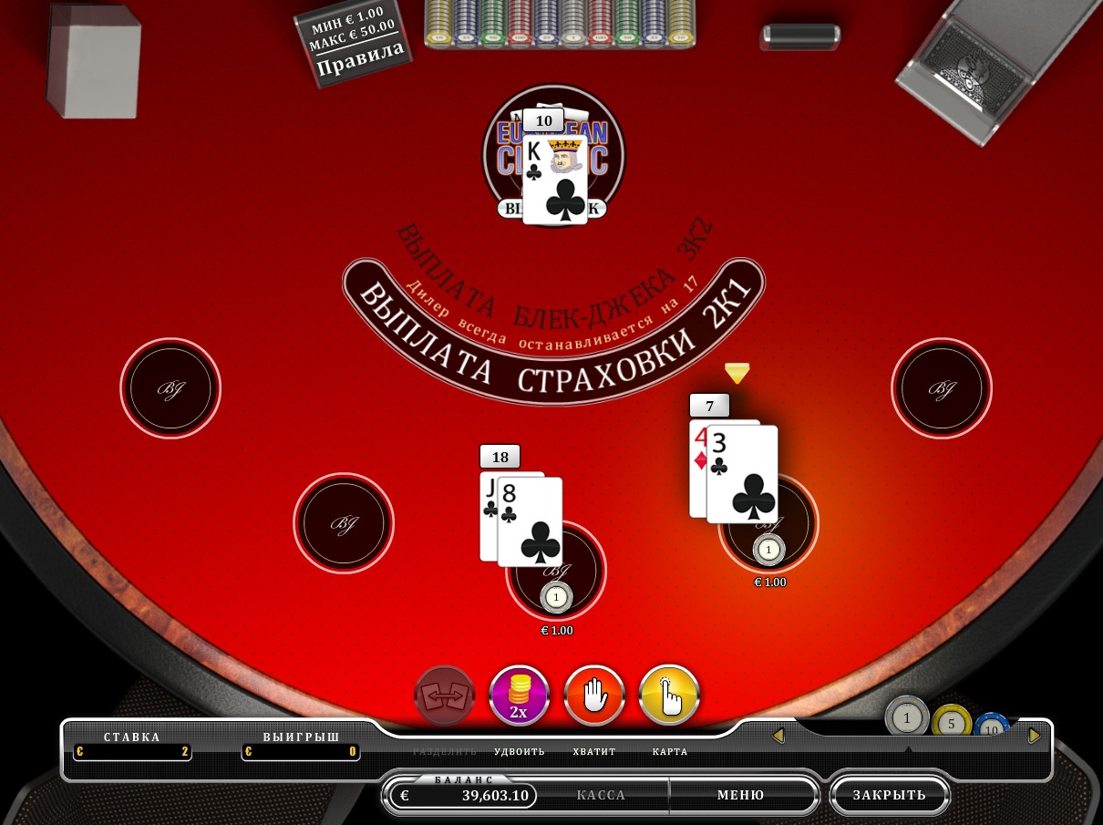 Классический европейский блэкджек на несколько боксов - эта старая добрая и хорошо известная всем игра.которая несомненно уже успела привлечь и уверена привлечет к себе еще много новых игроков.плюс вы можете поиграть для начало в нее пробно онлайн без регистрации
