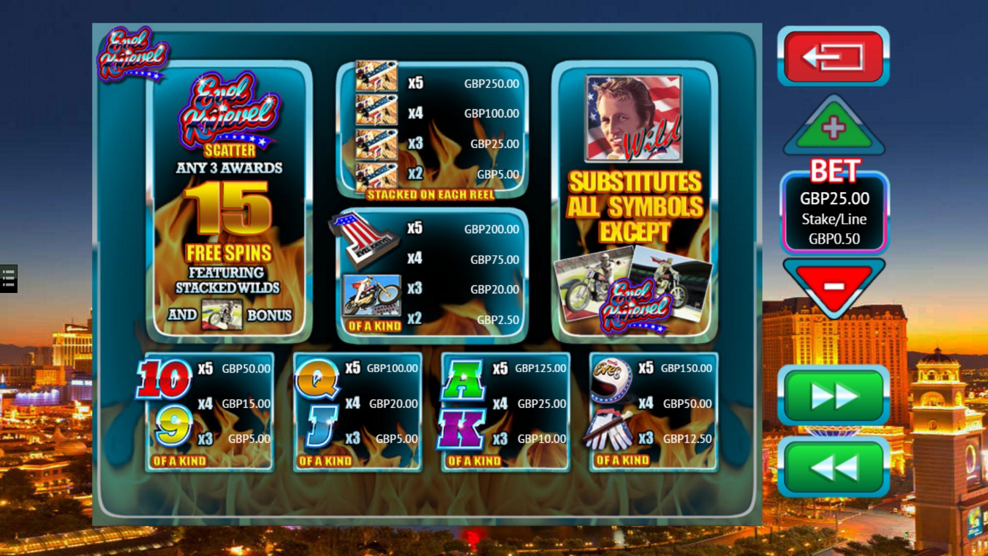 Для каждой из них действует свой коэффициент расчета выигрышей. Он бывает от х5 до х500. Этот показатель умножается на ставку по линии. Если комбинаций большей одной, выплаты суммируются. Раунда на удвоение в Evel Knievel нет.