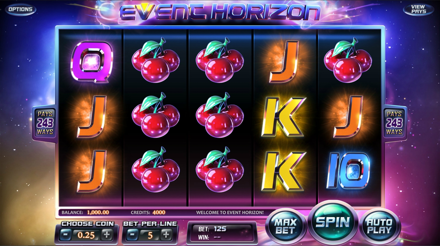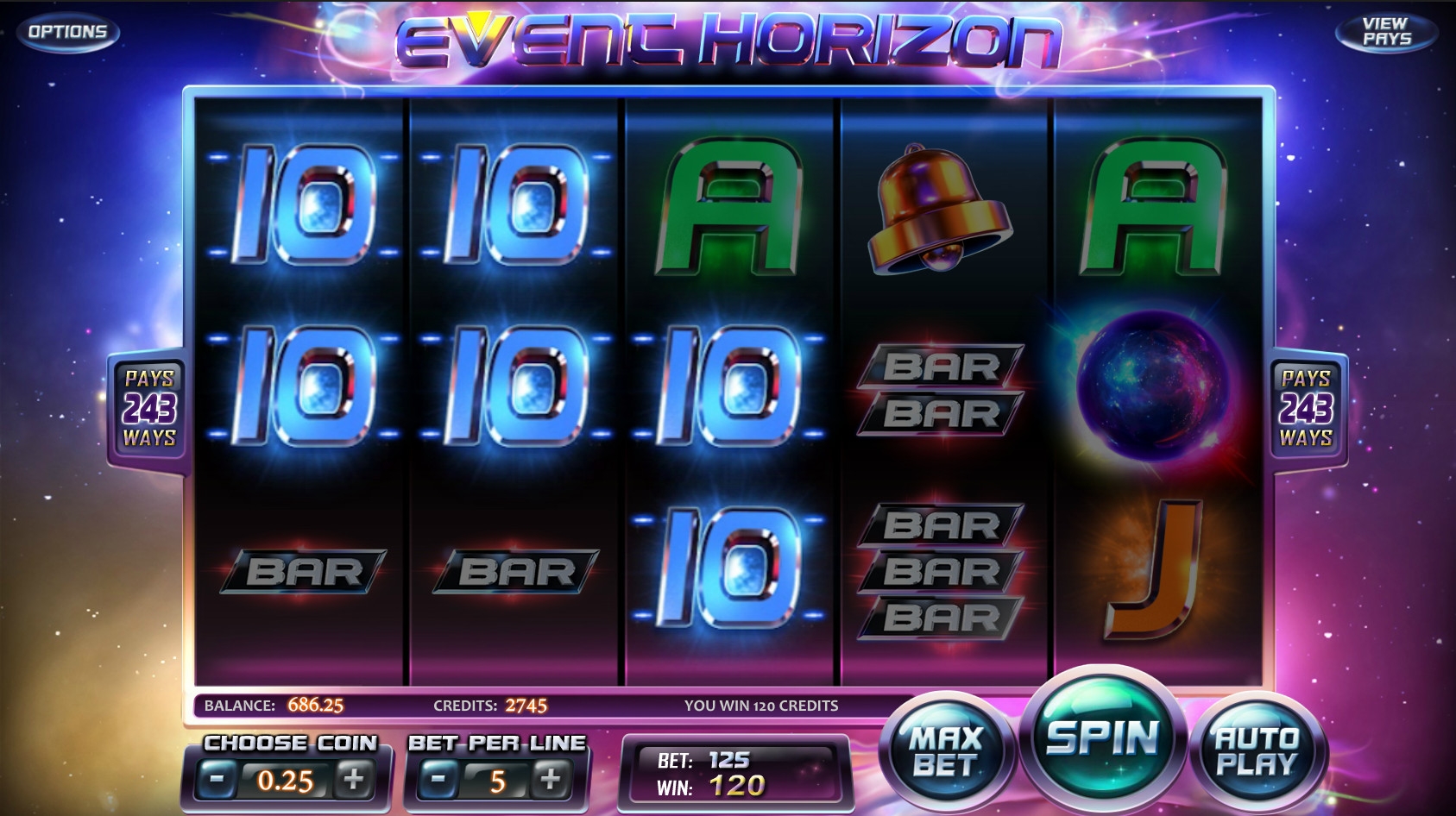 В Event Horizon пять барабанов и 243 способа получения выплат по комбинациям из базовых картинок. Активных линий здесь нет. Картинки выстраиваются по схеме 5х3.