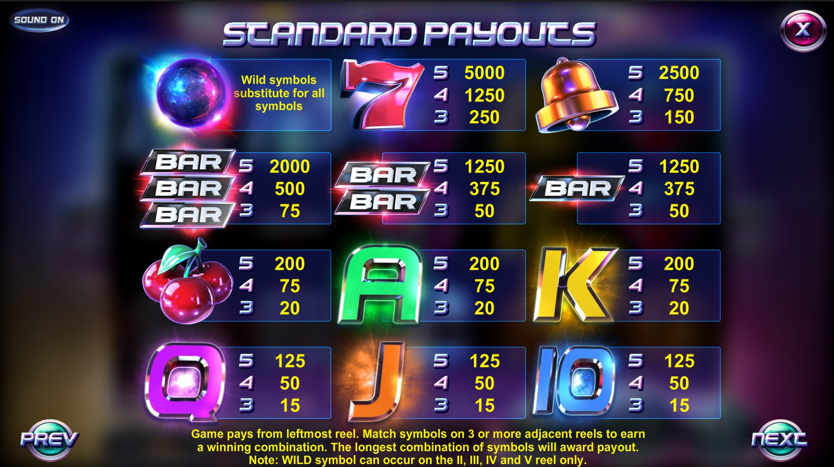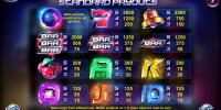 Надо сказать, что о космической тематике, которой посвящена модель, нам напоминает лишь фон и один из символов. Остальные картинки представляют собой трехмерные изображения предметов, которые традиционно используются в игровых автоматах со времен первых слотов. Речь идет о семерках, колокольчиках, полосках BAR, вишенках и номиналах игральных карт.