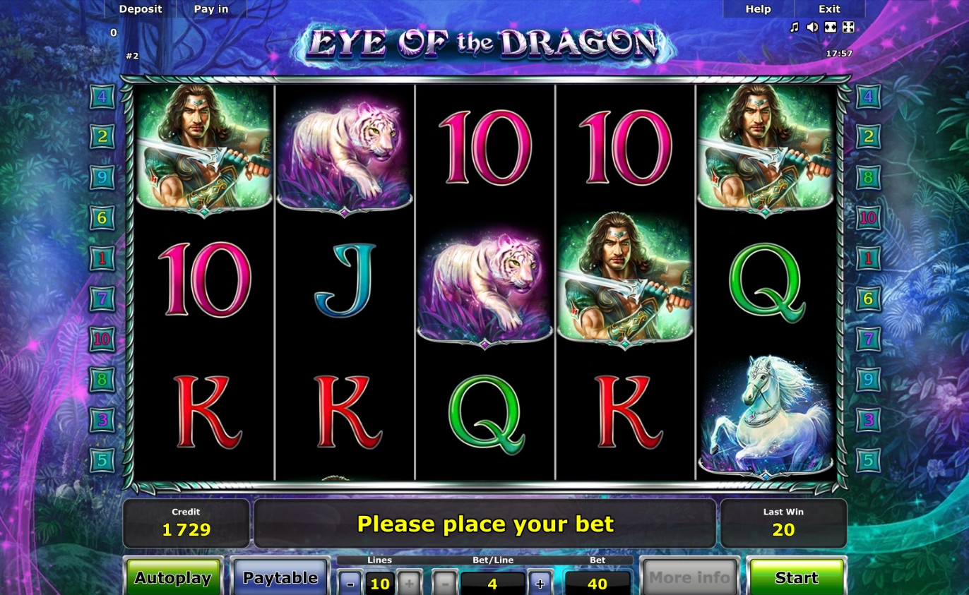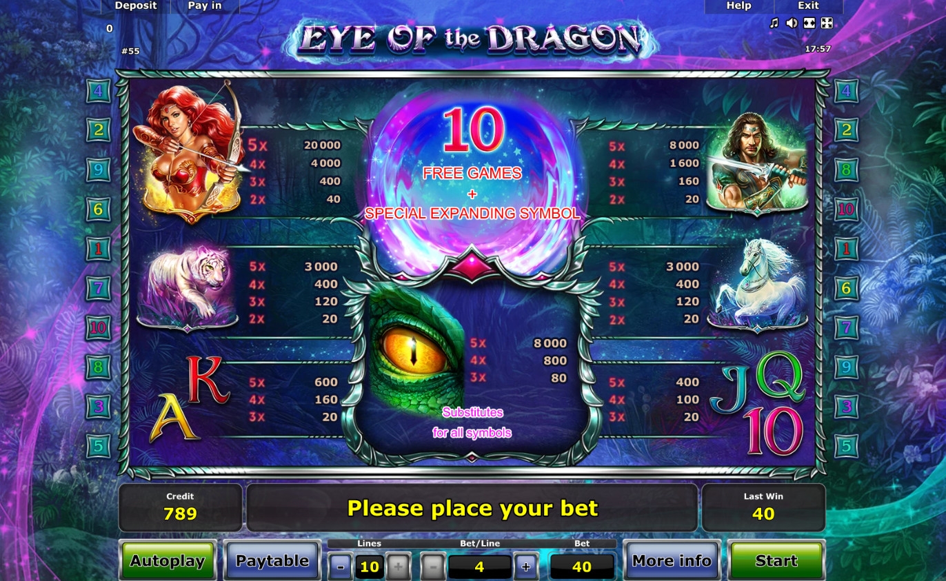 Зрелищный игровой автомат в стиле фэнтези-романов презентовала компания Novomatic. Он перенесет вас в мир ужасных драконов, беспощадных варваров и не ведающих страха амазонок. Чем еще, кроме интересной тематики и колоритных персонажей, интересен Eye of the Dragon, вы узнаете из обзора, подготовленного энциклопедией азарта Casinoz.