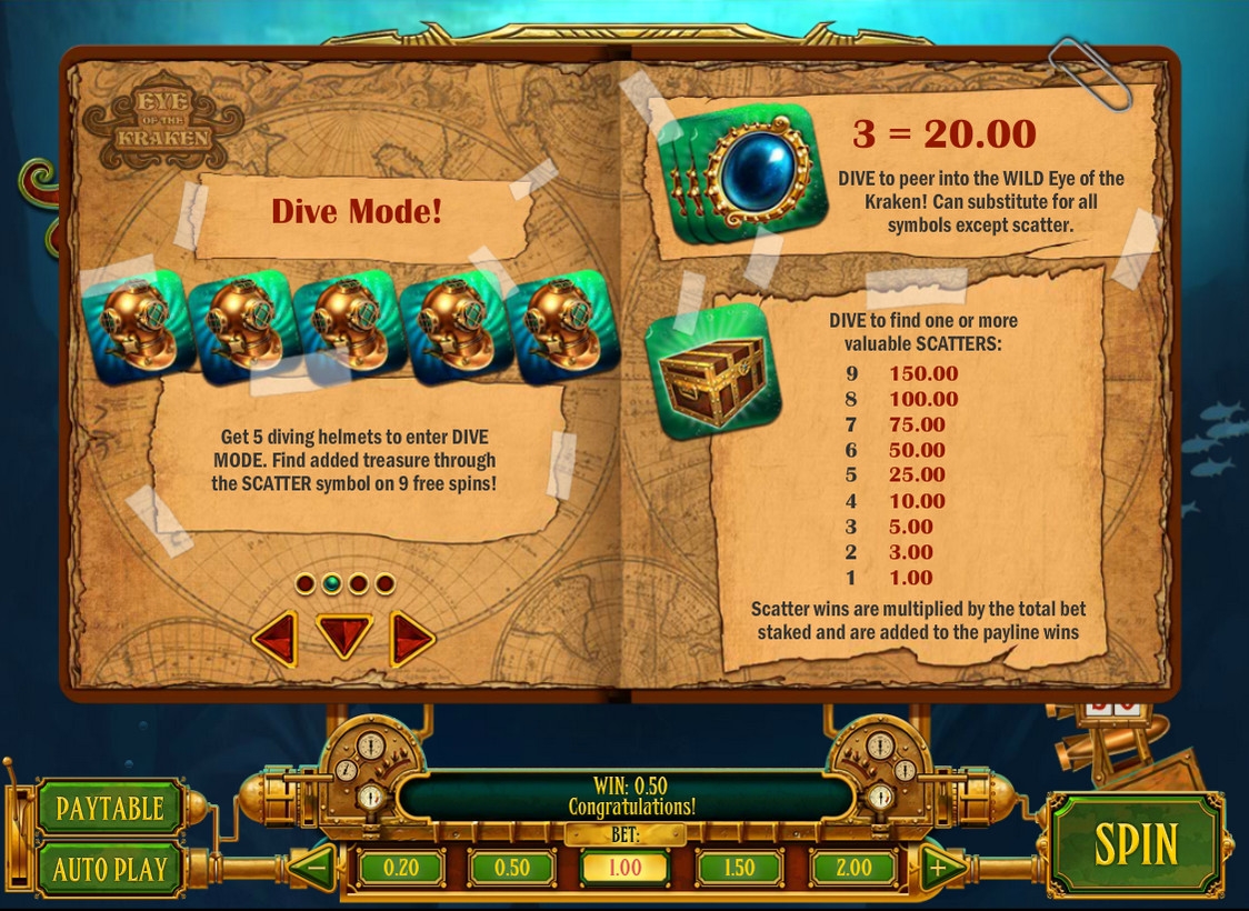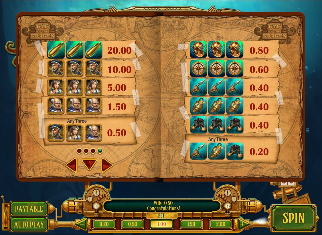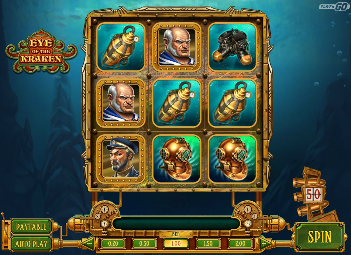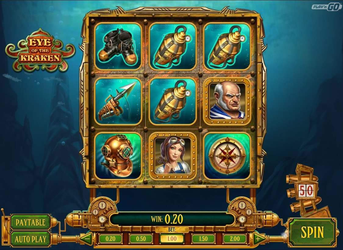 Eye of the Kraken представляет собой игровой автомат с девятью картинками на экране, располагающимися по схеме 3х3. Оплачиваемые комбинации образуются здесь по восьми линиям, расположенным по горизонтали, вертикали и диагонали. Поэтому можно утверждать, что каждая из девяти ячеек представляет собой отдельный барабан.
