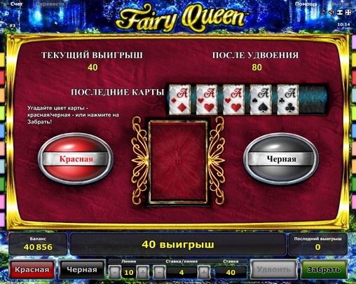 В игре на удвоение видео-слота Fairy Queen нужно угадывать цвет закрытой карты. Если вам это удастся, выплата увеличится в два раза. В случае ошибки вы проиграете ставку. В одном раунде можно играть до тех пор, пока вы не достигнете максимума (500 общих ставок) или не проиграете ставку.