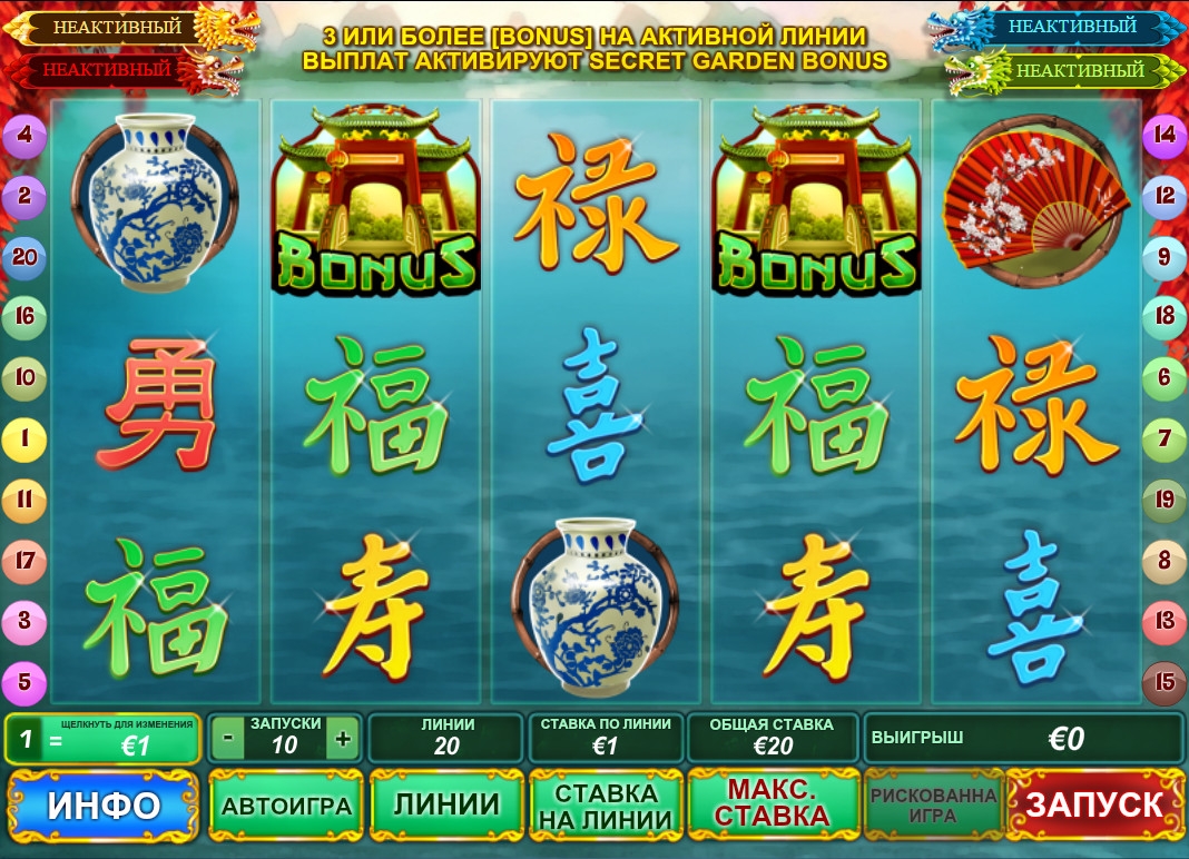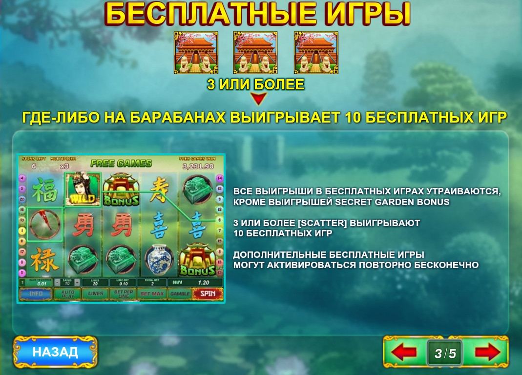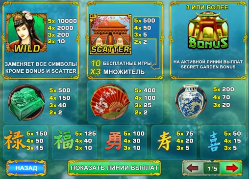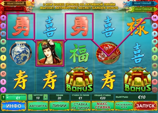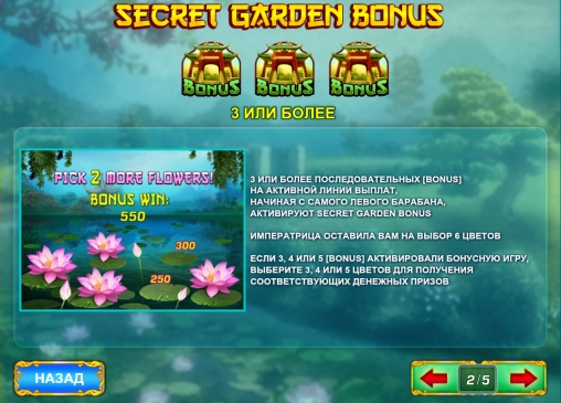 - Bonus начинает призовую игру «Тайный сад». Она стартует, когда от трех бонусных картинок выпадают на активной линии.