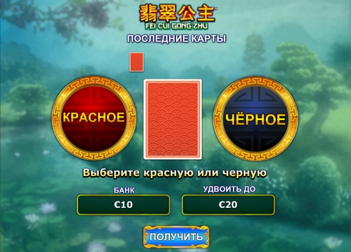В Fei Cui Gong Zhu есть раунд на удвоение, в котором можно участвовать при получении выплаты за спин. Здесь нужно угадывать цвет закрытой карты. Правильный ответ означает, что выигрыш увеличится в два раза. При ошибке деньги уходят в кассу заведения. Можно играть несколько раз подряд, пока не будет достигнут лимит, зависящий от ставки.