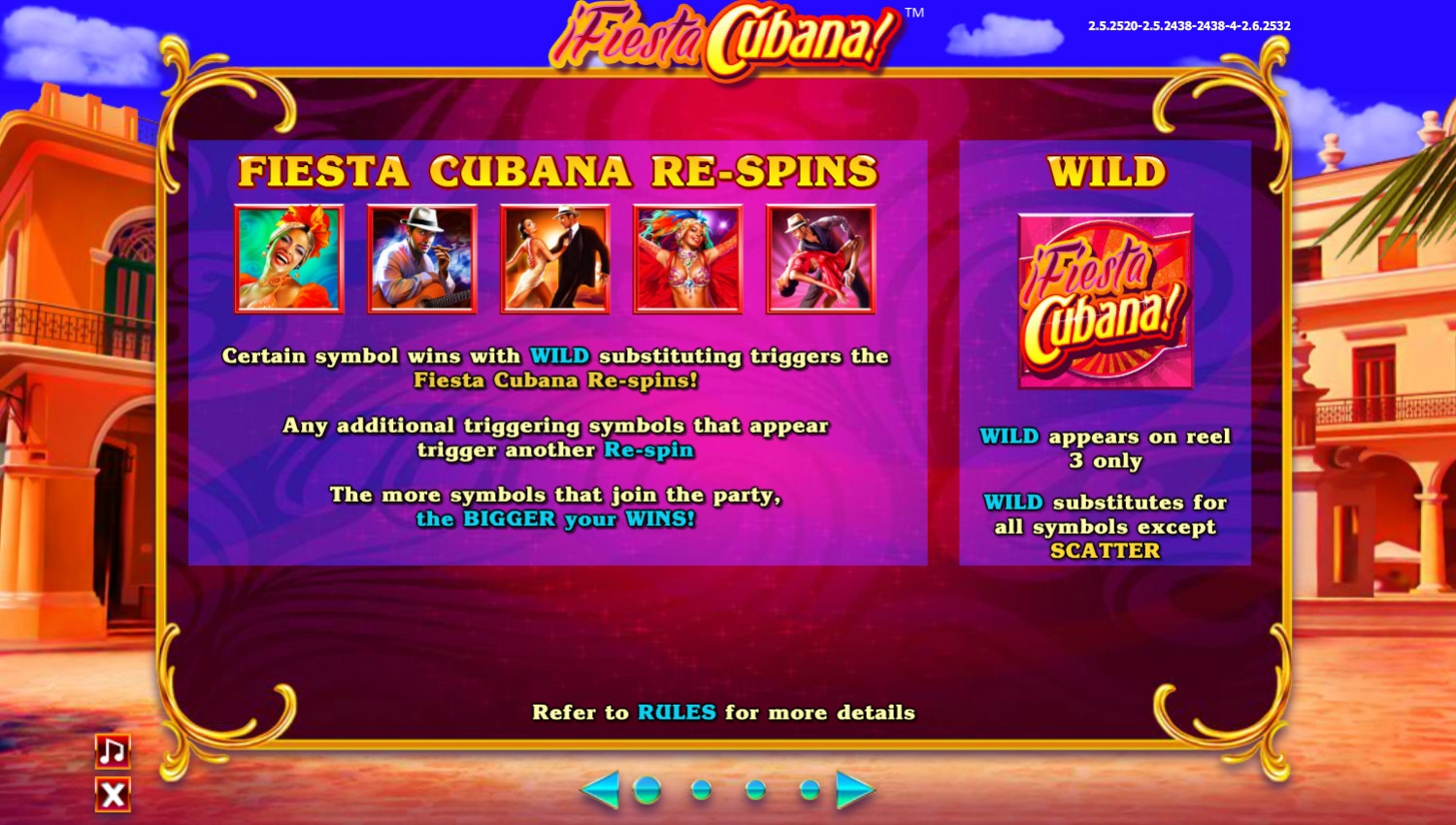 Настройки ограничены возможностью отключения звука и выбора удобного размера экрана. Вам не придется скачивать игровой автомат Fiesta Cubana, так как он запускается прямо на сайте казино в браузере.