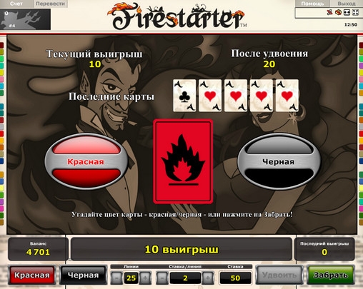По каждой линии в видео-слоте Firestarter выплата полагается лишь за старшую комбинацию. Все выигрыши складываются, и общую сумму можно перевести на счет или поставить на кон в риск-игре. Здесь нужно угадать цвет закрытой карты. Если вам это удастся с первой попытки, выплата удвоится. Если ошибетесь, то проиграете ставку. В данном раунде может действовать лимит выигрыша, установленный правилами казино.