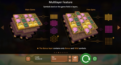 Сверху располагаются пятнадцать иконок, выстраивающихся по схеме 5х3. Это стартовое игровое поле, на котором составляются комбинации на начальном этапе. В нижерасположенных слоях элементов больше. Они располагаются по особым схемам, обозначенным в таблице.