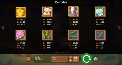 В качестве базовых символов используются деревянные костяшки маджонг с изображениями одного, двух и трех бамбуковых стеблей, лотоса, жасмина, рыбки, кошки и золотых слитков.