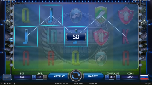 «Футбол: Кубок чемпионов» - это виртуальный слот с пятью барабанами и пятнадцатью символами на экране. Играть можно лишь по двадцати постоянно задействованным полосам, на которых формируются комбинации.
