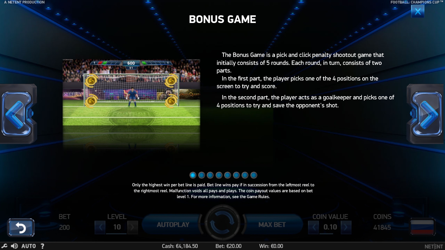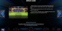 - Бонусный раунд выдержан в футбольной тематике. Сначала вы будете бить пенальти, указывая на одну из точек в воротах. А во втором заходе вы будете выступать в роли вратаря, пытающегося отражать пенальти. Перед каждым ударом вам нужно будет указать на одну из четырех точек, куда будет прыгать ваш персонаж в надежде отбить мяч. Удачные попытки могут принести выплату или увеличить коэффициент, который будет учитываться в дальнейшем.
