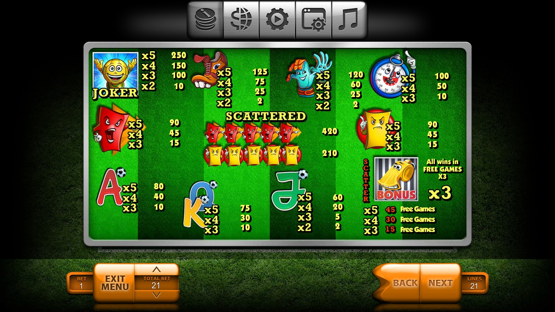 В меню есть таблица выплат, правил, общие параметры, настройки автоигры и другие диалоговые окна. Настраивать можно звук, размер экрана и прочие опции. Скачивать Football нет необходимости.