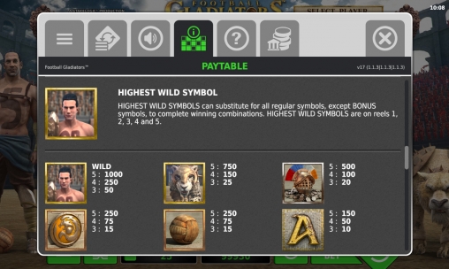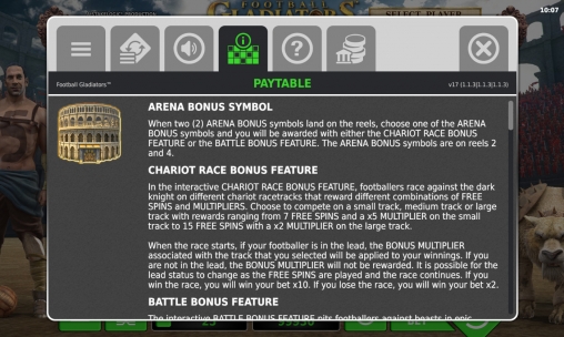 В «Футбольных гладиаторах» есть простые и особые картинки разных типов, тематический бонусный раунд и другие призовые опции.