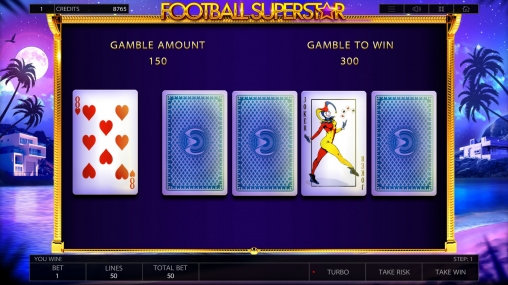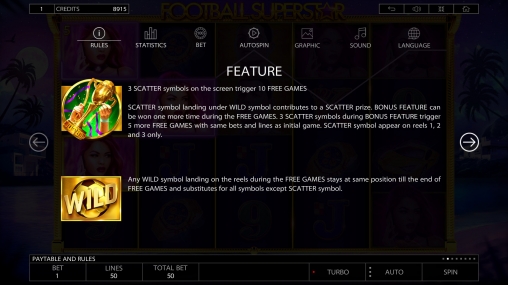 В игровом автомате «Суперзвезда футбола» пять барабанов, пятьдесят линий и двадцать картинок на главном экране. Разрешается задействовать не все активные полосы.