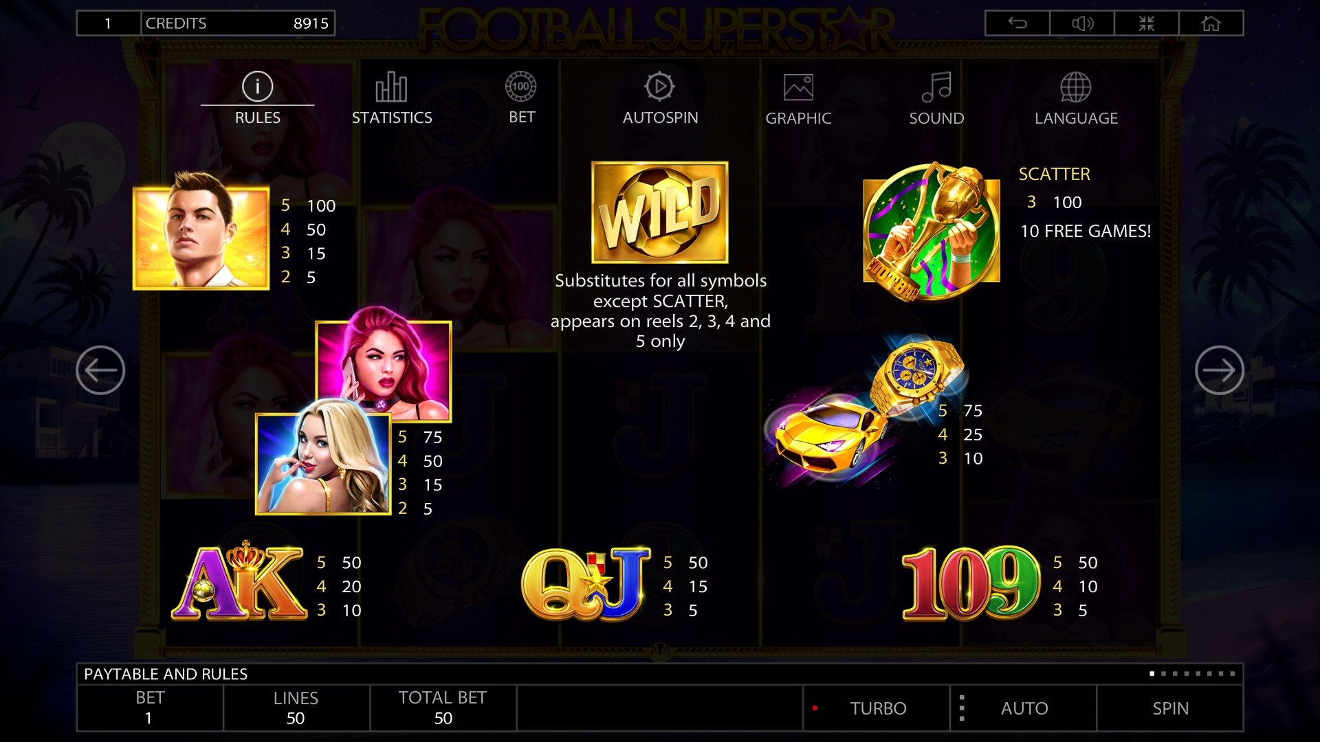 Главный герой видео-слота – молодой футболист, напоминающий Криштиану Роналду. Также на барабанах изображены его поклонницы, золотые часы, желтый гоночный автомобиль и обозначения игральных карт от девятки до туза.