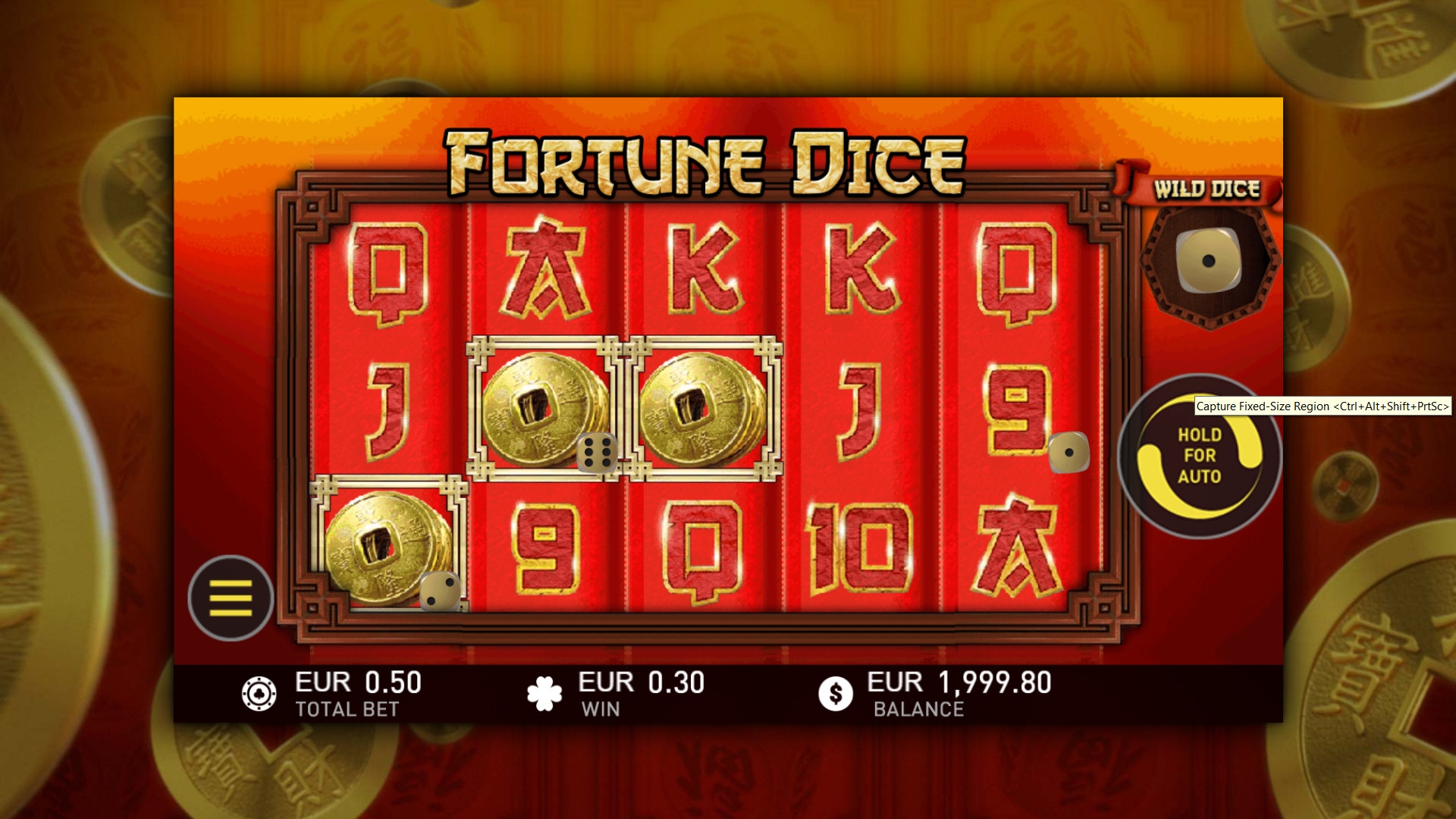 игровом автомате Fortune Dice пять барабанов, пятьдесят фиксированных полос и пятнадцать ячеек для символов на основном экране. Ставки на линии равны: от одного до восьмидесяти центов на каждую (0.50 – 40 долларов на спин).