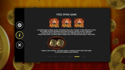 - Free Spins – Начинаются семь вращений на деньги онлайн-казино по последней ставке. Здесь выпадают по две игральных кости. Точки на их гранях означают размер множителя, учитываемого при расчете выплат. Если выпадут две шестерки, начнется раунд Fortune Chance.