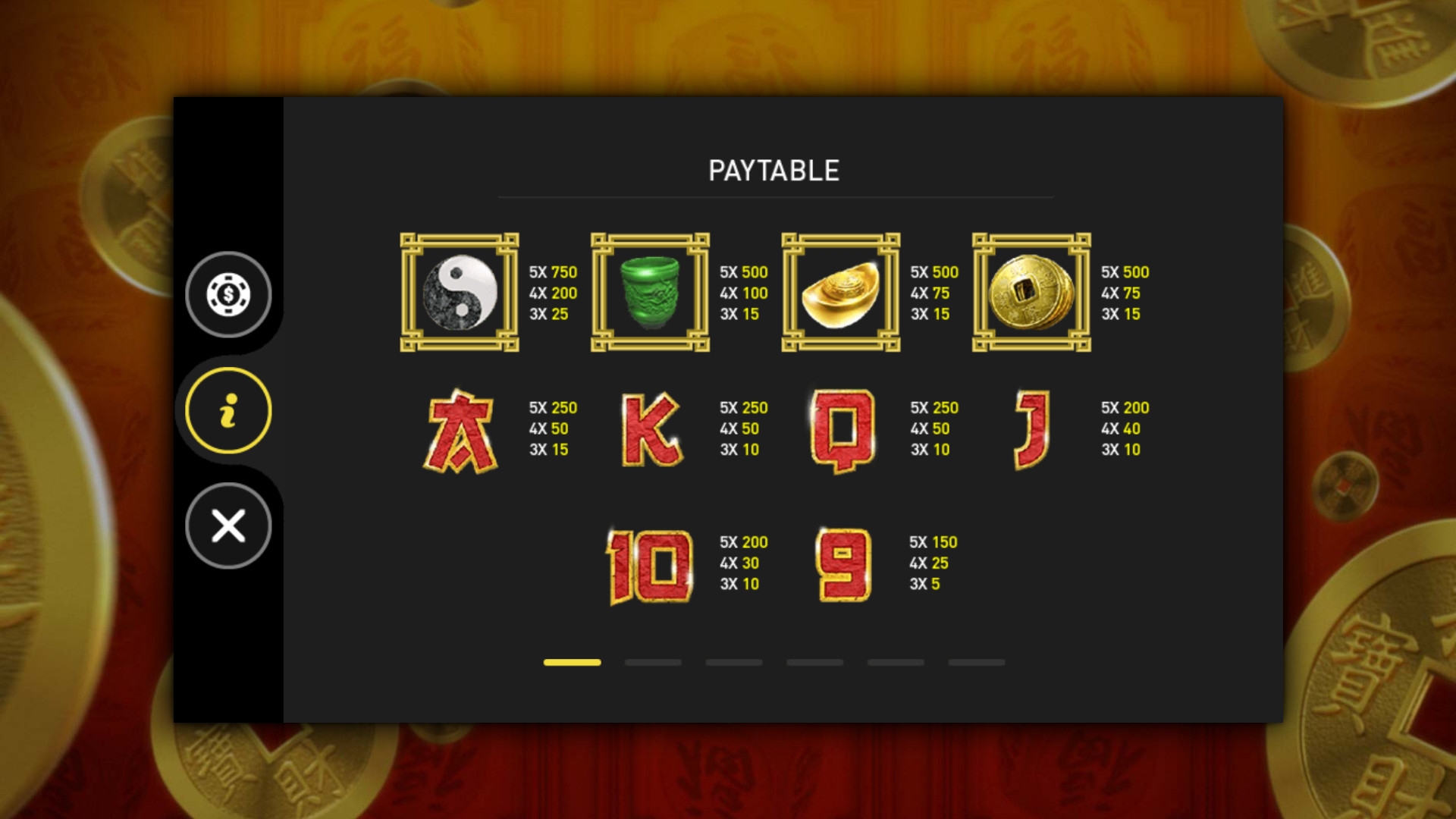 Создатели модели изобразили на барабанах шесть карточных номиналов, стилизованных под иероглифы, знак инь-ян, нефритовую вазу, золотой слиток и монетки с дырочками.