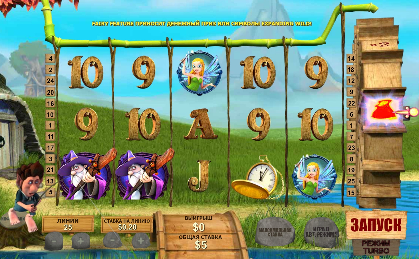Волшебная палочка – Дает выплату в размере шести, восьми, десяти или пятнадцати общих ставок. Также превращает второй и четвертый барабаны в расширенные символы Wild, которые принимают участие в образовании комбинаций. Функция доступна лишь в основной игре.