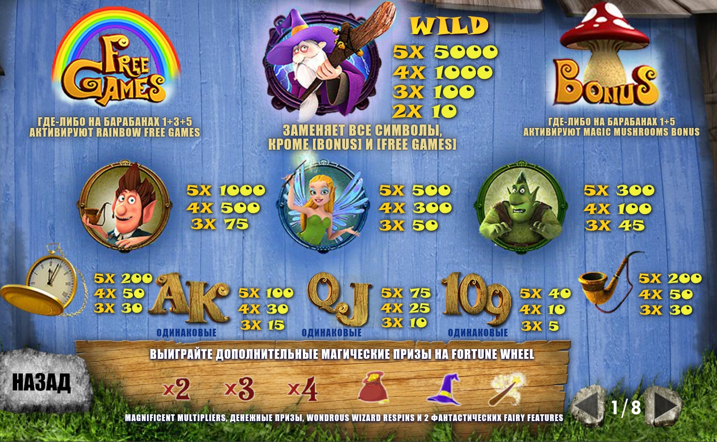 Также здесь представлены специальные символы Wild (волшебник), Free Games (радуга) и Bonus (большой мухомор). Рассмотрим их особенности.