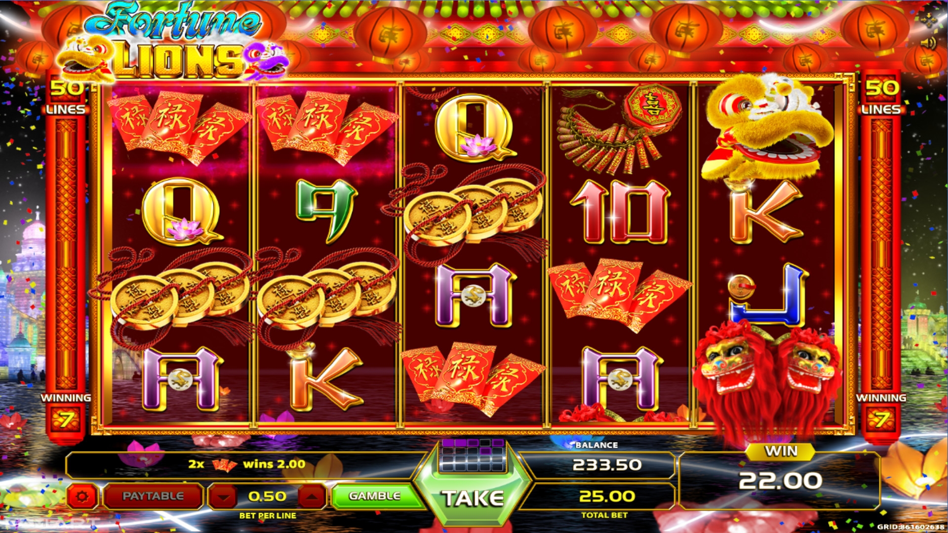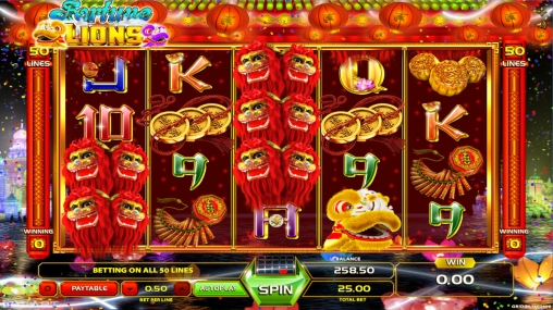 Игровой автомат Fortune Lions имеет пять барабанов и пятьдесят фиксированных полос для образования комбинаций. Картинок на экране двадцать.