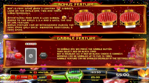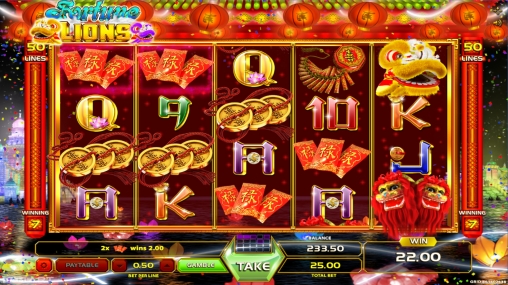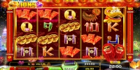 Маскарадные львы, золотые монеты с дырочками, фейерверки, карточки с золотыми иероглифами – эти и другие тематические предметы можно увидеть на барабанах автомата Fortune Lions. Двойные картинки с красными львами идут полосами и могут занимать даже все ячейки на экране.