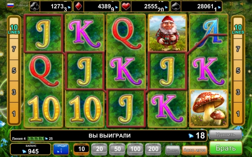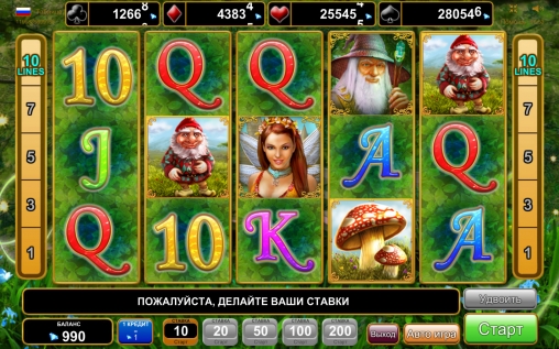 В Fortune Spells используется десять картинок, одна из которых обладает особыми возможностями. Но сначала о базовых элементах. Таковыми являются изображения волшебника, феи, гнома, мухоморов и разноцветных номиналов игральных карт от десятки до туза.