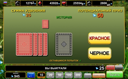 Все эти деньги клиент может забрать или поставить в раунде на удвоение. Здесь нужно угадывать цвет карты. Если ответ правильный – выплата увеличивается в два раза. При ошибке кредиты уходят в казино. Подряд можно играть несколько раз, пока не будет достигнут лимит.