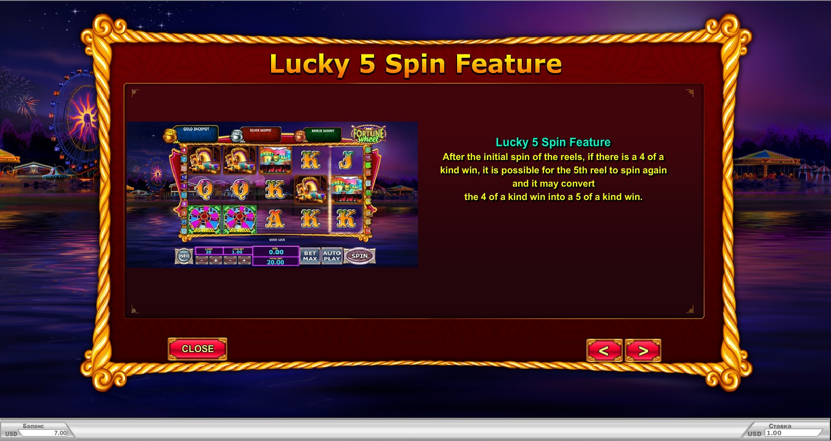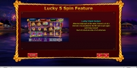 Если образуется комбинация из четырех одинаковых картинок, может быть активирована опция Lucky 5 Spin (она задействуется случайным образом). В таком случае пятый барабан будет вращаться бесплатно еще раз, что дает дополнительные шансы на формирование цепочки из пяти символов.