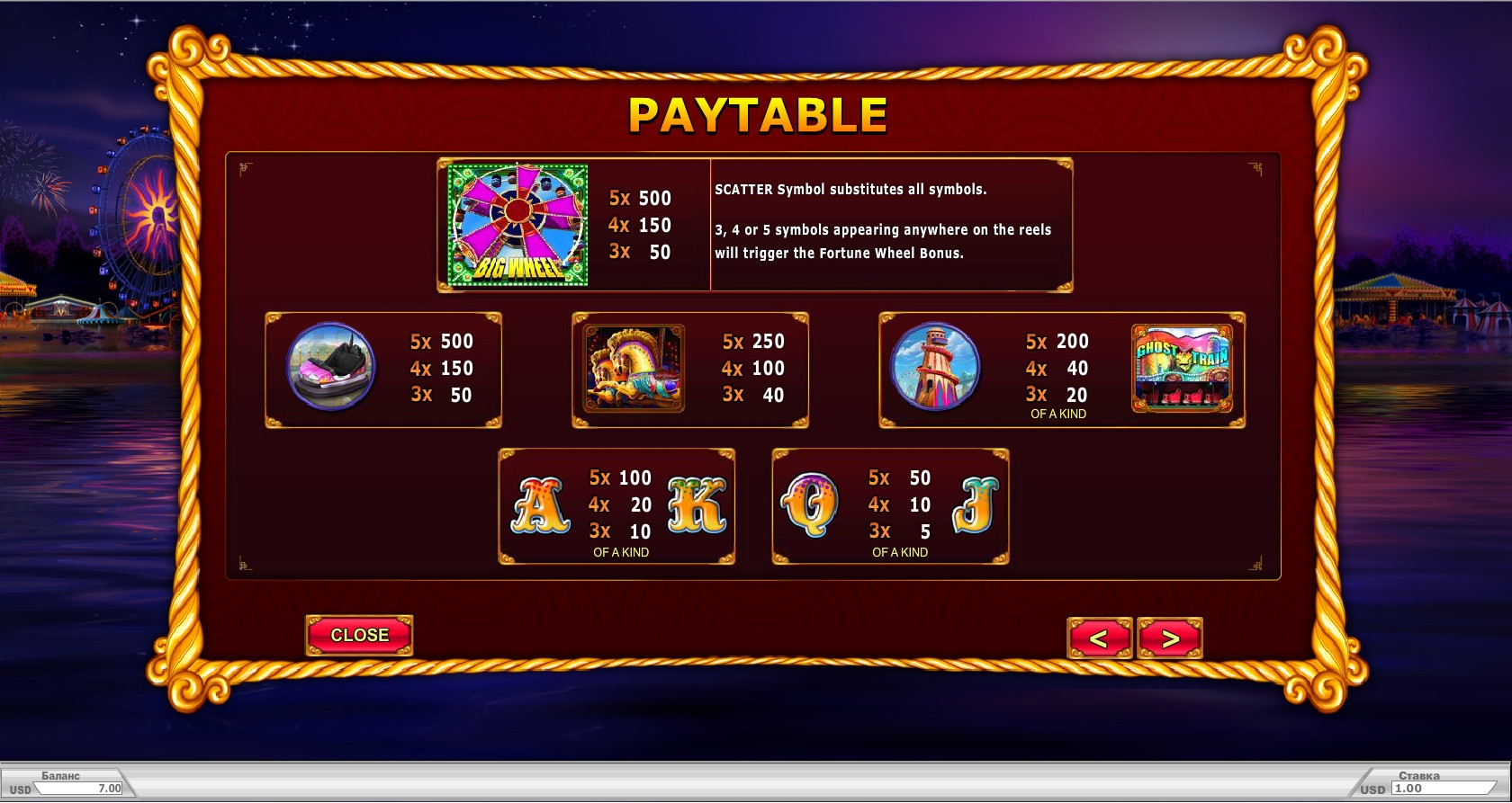 На экране аппарата появляются изображения различных аттракционов и номиналы карт от валета до туза, выдержанные в соответствующем тематике стиле.