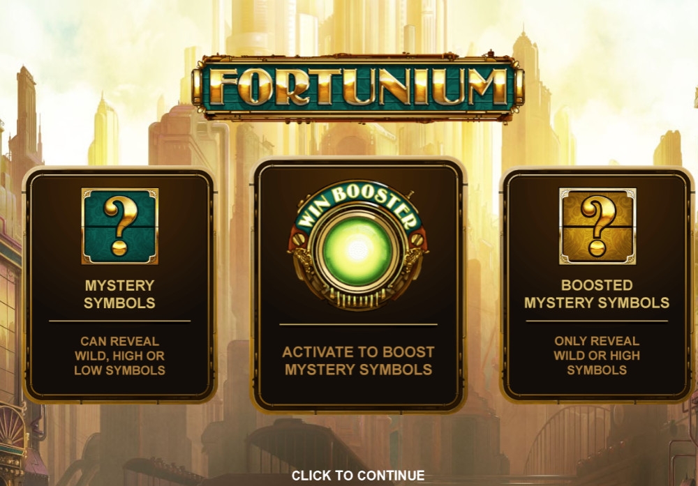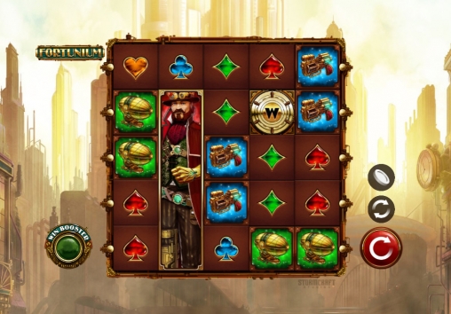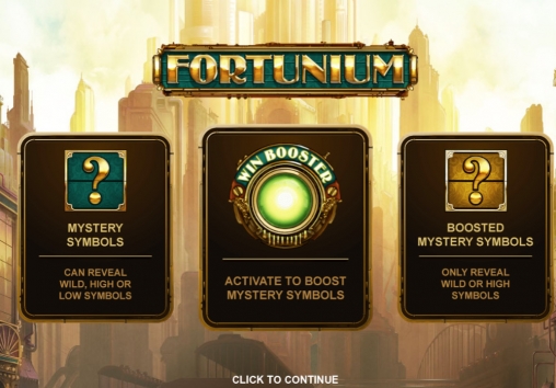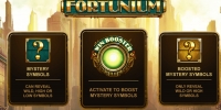 игровом автомате «Фортуниум» задействованы стекированные базовые картинки, джокер, скаттер, «таинственный» символ, функция Win Booster и фри-спины с дополнительными призами.