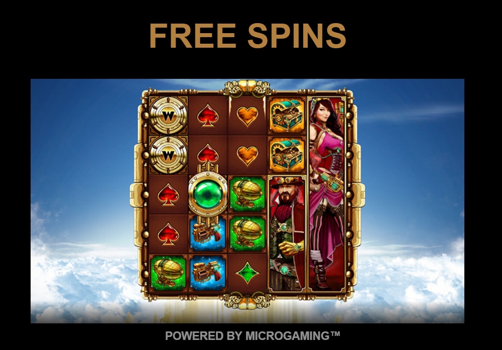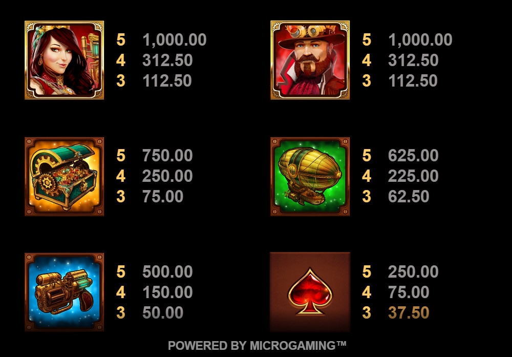В столбцах появляются карточные масти, дирижабль, оружие, сундук с драгоценностями и главные герои слота: Виктория и Максимилиан. Одинаковые элементы выпадают длинными вертикальными стеками.