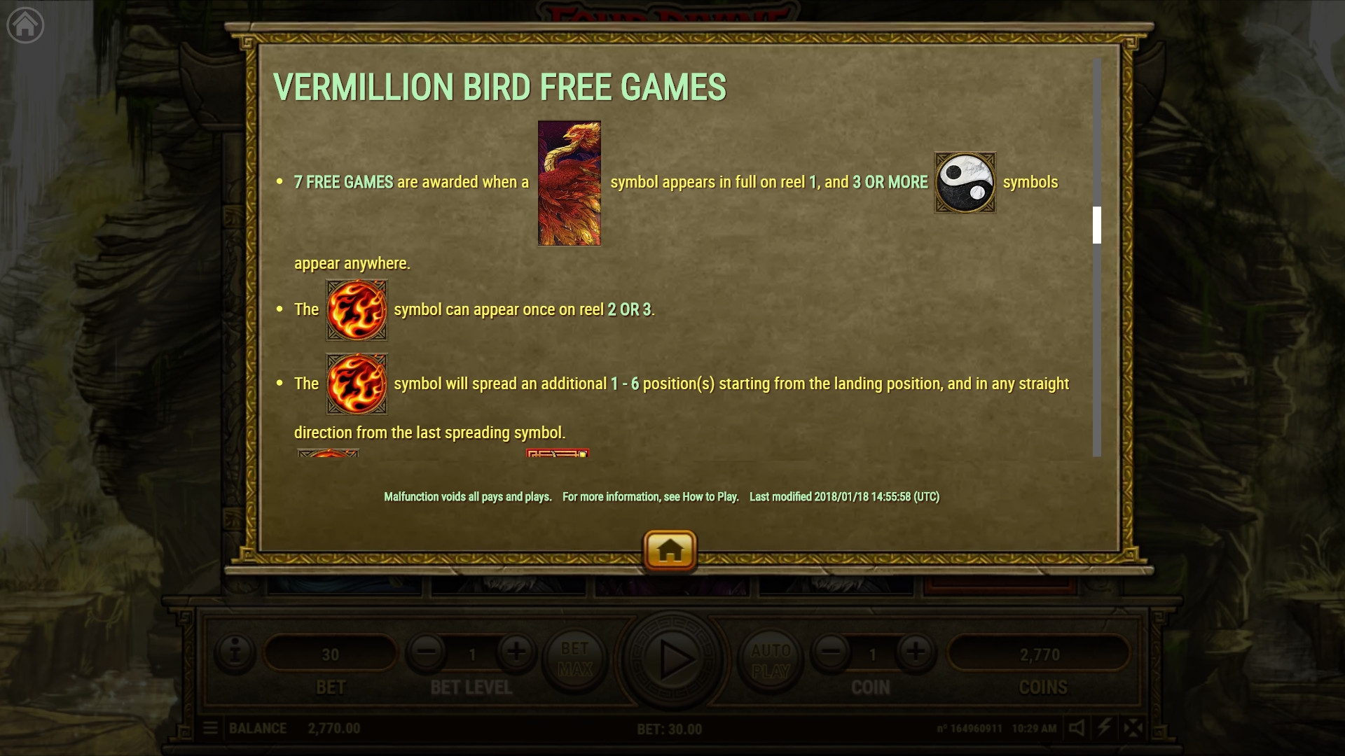 - Vermillion Bird Re-Spins – Джокер в виде огненного шара выпадает в каждом респине на одном из первых трех барабанов. Он расширяется на одну позицию.