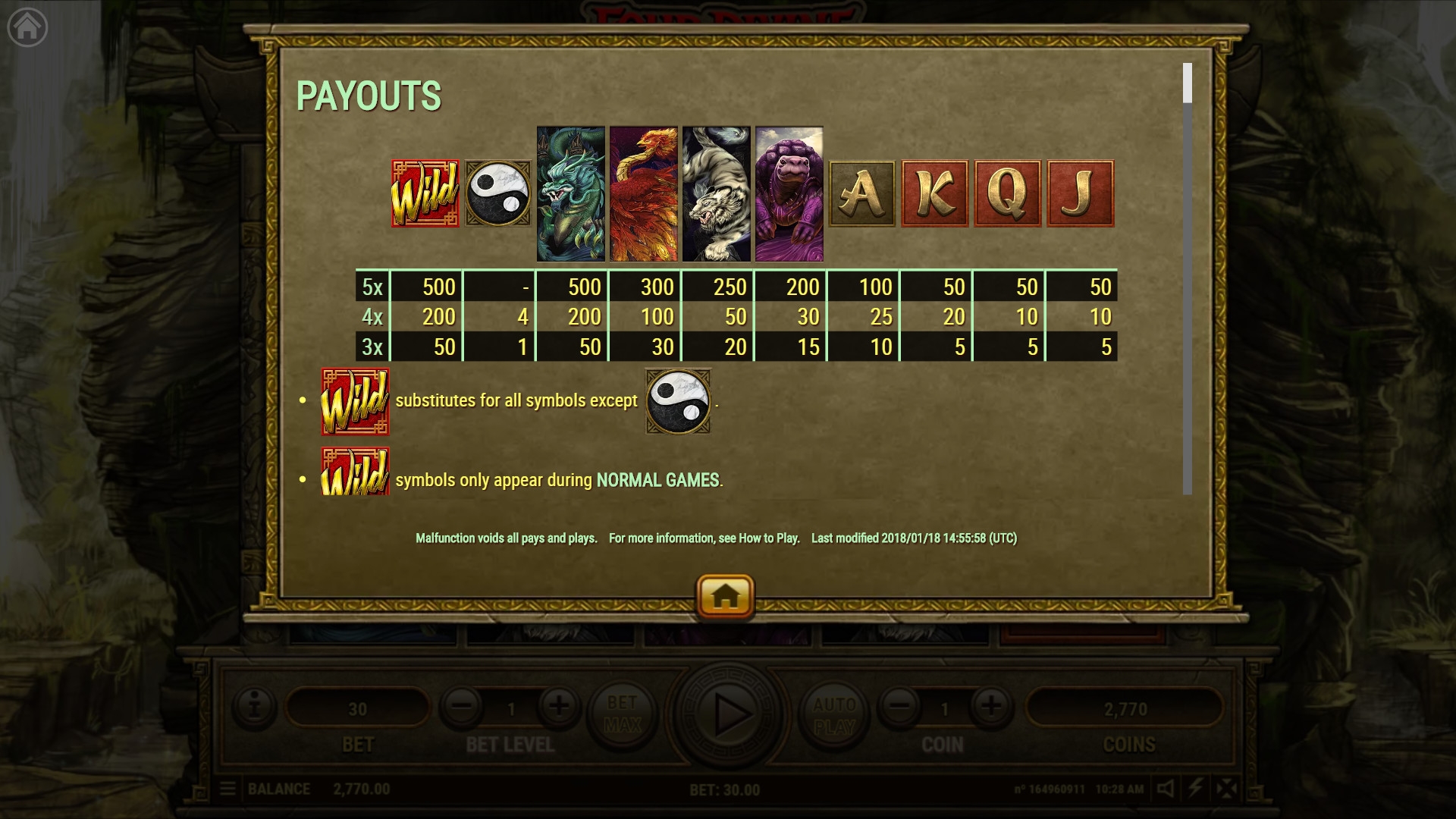 На экране видео-слота появляются вышеупомянутые звери и буквы J, Q, K и A. Четыре священных животных занимают на барабанах по две ячейки по вертикали.
