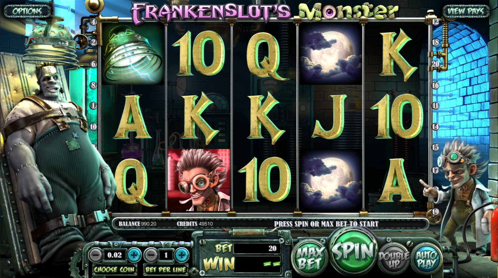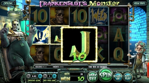 Запустив игровой автомат Frankenslot's Monster, вы увидите доктора Франкенслота, прототипа главного героя романа Мэри Шелли, сотворенного ним монстра, приборы из лаборатории, полную луну, а также номиналы карт от десятки до туза. Эти картинки являются базовыми, а особые функции выполняют следующие символы (вы узнаете их по надписям):