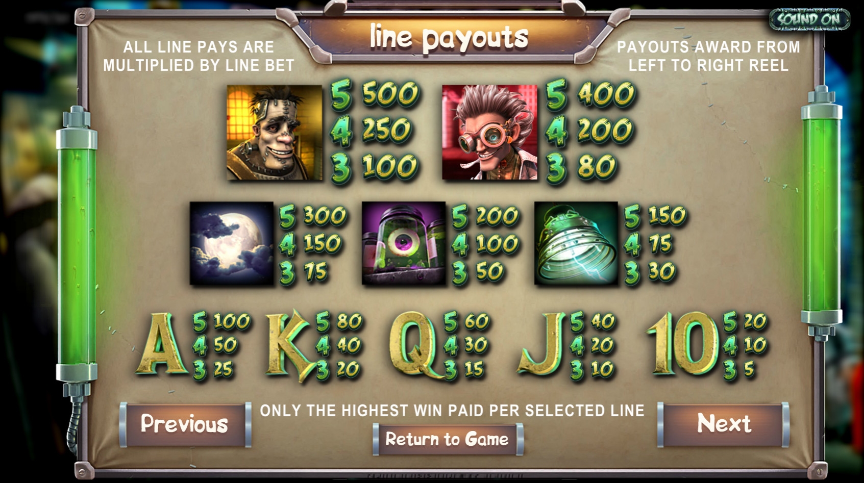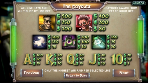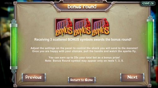 В «Чудовище Франкенслота» есть призовой раунд по теме слота. Вам нужно будет запустить прибор, чтобы узнать, какая бонусная выплата вам полагается. Она может достигать двадцати пяти суммарных ставок.